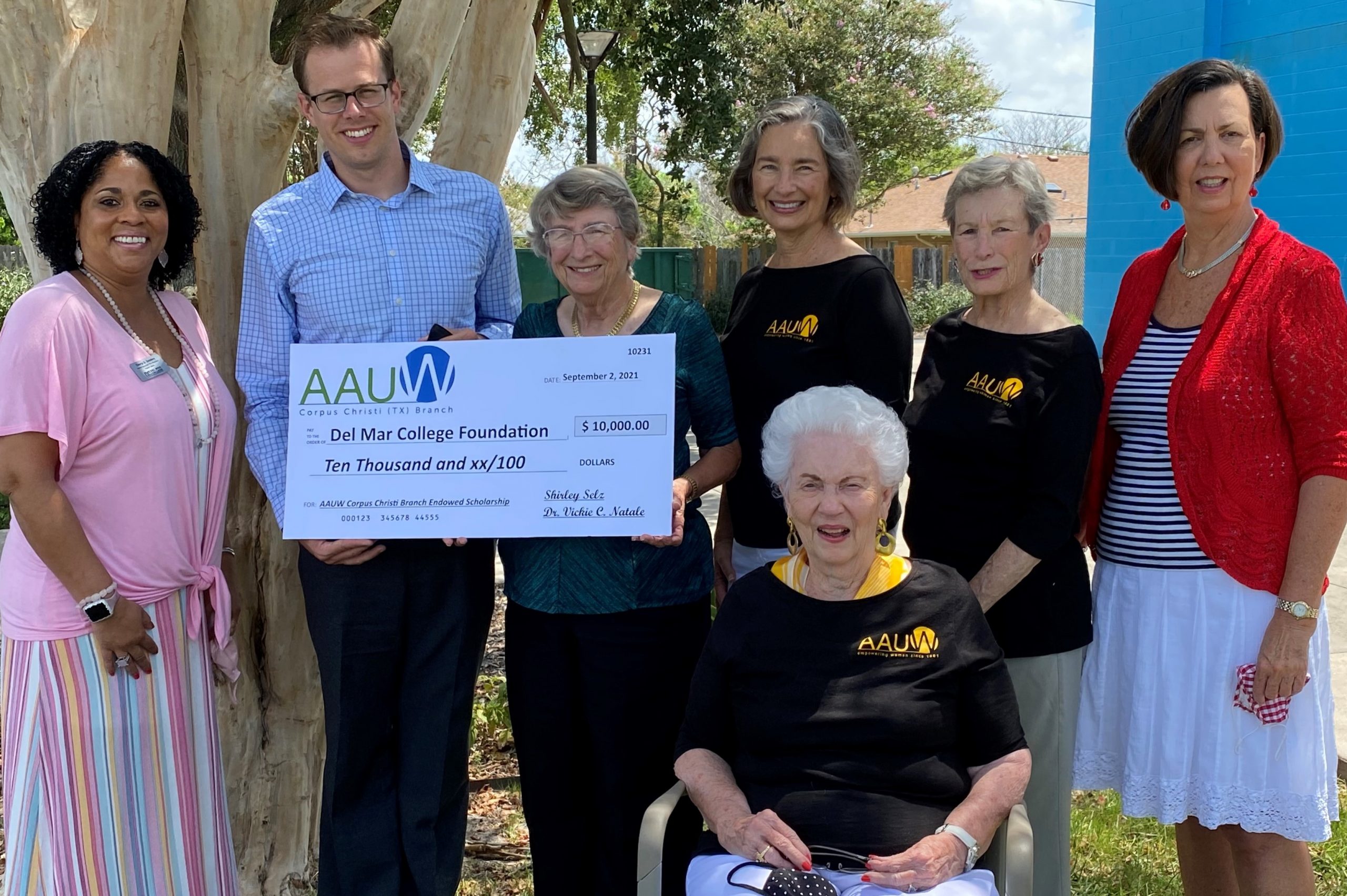 Standing: Cheryl Sanders, Del Mar College Interim Associate Vice President for Student Affairs; Matthew Busby, DMC Director of Development; Shirley Selz, AAUW Branch President; Dr. Vickie Natale, AAUW Finance Officer; Dottie Ewing, AAUW Vice President of Funds; Susan Birchfield, AAUW Secretary. Seated: Betty Maroney, AAUW chair of Book Finders.