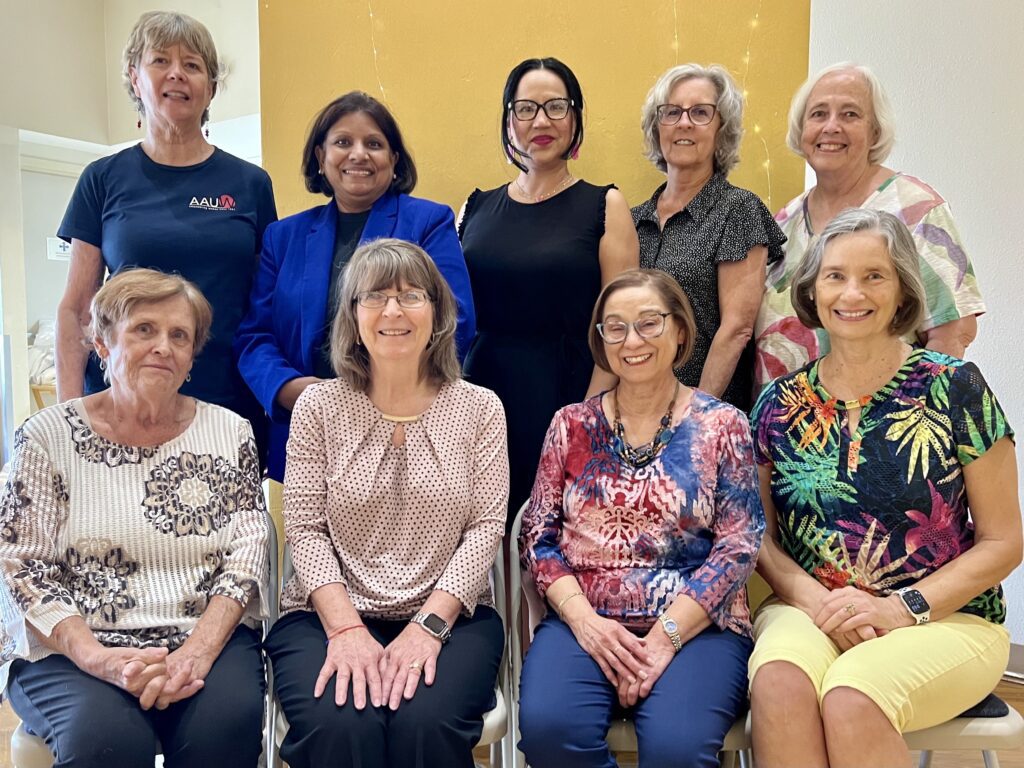 Branch Officers for 2025-26, standing: Dr. Catherine Cox, Parliamentarian; Alka Khanolkar, Membership VP; Jennifer Gonzales, STEM Chair; Sharon Trott, Funds VP; Jan Hilton, Secretary. Seated: Kris Conlan, Book Finders Co-chair; Kelly Gonzalez, President; Dr. Jo Rios, Program VP; Dr. Vickie Natale, Finance Officer.